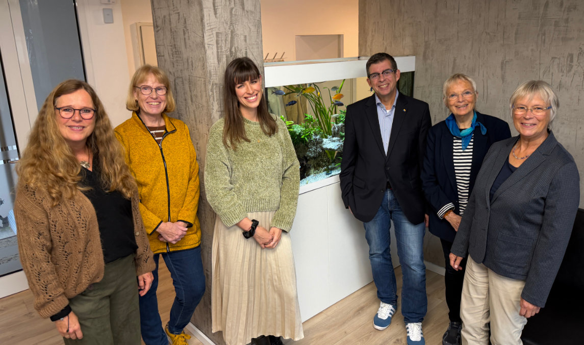 Fotos: Leif Schmittgen --- Vor dem Aquarium begann der Rundgang, zu dem Monika Weispfennig (2.v.re.) und ihre Mitstreiterinnen Bürgermeister Frank Helmenstein in die neuen Räumlichkeiten eingeladen hatten.