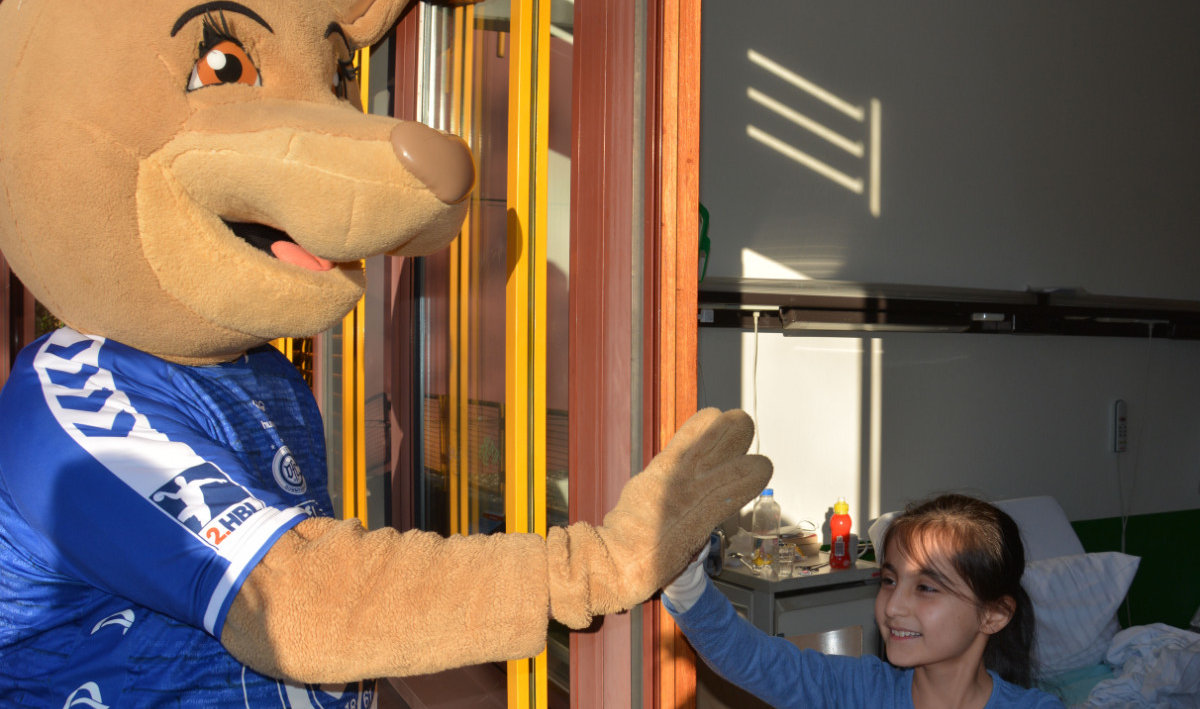 VfL-Maskottchen Gummi sorgte auch in diesem Jahr auf der Kinderstation des Gummersbacher Kreiskrankenhauses für viel Freude, als er - bepackt mit vielen schönen Geschenken - als sportlicher Weihnachtsmann an den Fenstern der jungen Patienten entlang hüpfte. Die Fans des VfL Gummersbach hatten in den vergangenen Wochen bei den Heimspielen des Zweitligisten verpackte Präsente am Stand von Förderverein und Kinderklinik abgegeben. Rebecca Timm, Schwester des ehemaligen VfL-Spielers Marcel Timm, absolviert zurzeit ein Freiwilliges Soziales Jahr auf der Kinderstation und hat sich mit viel Engagement um die Verteilung der passenden Päckchen gekümmert.