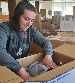 [Die Sachspenden wurden in Kisten gepackt, welche anschließend beschriftet worden sind.]