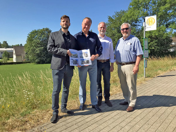 [Architekt Daniel Ebert (v.l), Thomas Baumann (Geschäftsführer Secon Bau und Boden ), Bauherr Ralf Dettmer (Rocon) und Bürgermeister Stefan Meisenberg.]