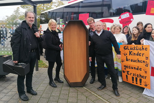 „So kann das nicht weitergehen“, sagte auch Karin Archut vor der Abfahrt der Busse. Die pädagogische Fachberaterin im DRK-Kreisverband sprach davon, dass es den Demonstrierenden nicht um eine finanzielle Höherstufung des Personals gehe. „Die ist erfolgt. Trotzdem geht es ums Geld“, so Archut. Die steigende Inflation habe dazu geführt, dass Sachkosten und Personalkosten für die Einrichtungen und Dienste in existenzbedrohender Weise angestiegen seien. Was allerdings fehle, sei eine ausreichende öffentliche Refinanzierung.