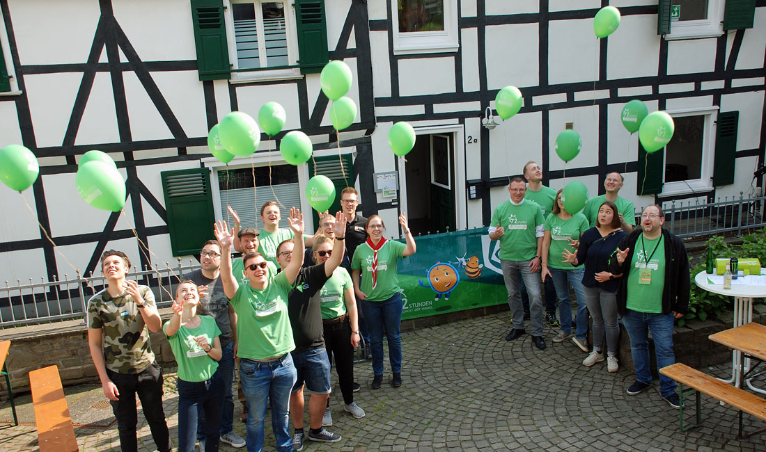 Am Donnerstag feierten am „Severinushaus“, dem Pfarrheim von St. Severin in Lindlar, um 17:07 Uhr viele Jugendliche den Auftakt der 72-Stunden-Aktion des Bundes der Deutschen Katholischen Jugend (BDKJ). Im Namen der Schirmherren Bodo Löttgen (Mitglied des Landtages NRW) und Willibert Pauls gestalteten der Vorstand des BDKJ-Oberberg, Präses Pfarrer Stephan Berger (Kreisjugendseelsorger), Tim Ochsenbrücher, Tim Nitschmann und Anna-Lena Theisen (Kolpingjugend), Matthias Horn, und Torsten Wolter (beide Katholische junge Gemeinde KjG), sowie Mitglieder des Koordinierungskreises zur Vorbereitung der Aktion diesen Auftakt mit den Jugendlichen und ließen mit ihnen zum Start grüne Luftballons in den Himmel steigen. Jede Gruppe, die sich mit ihrem Projekt angemeldet hatte, bekam ihr „Starterpaket“ überreicht. Für eine Aktionsgruppe, die Junge Union Oberberg, wurde außerdem endlich das Geheimnis gelüftet: Sie erfuhren, welchem Projekt sie sich in den nächsten drei Tagen widmen werden, da sie die Überraschungsvariante „GET IT“ gewählt haben. Zum Thema 70 Jahre Frieden werden sie in Morsbach ein Kriegerdenkmal von Moos befreien.