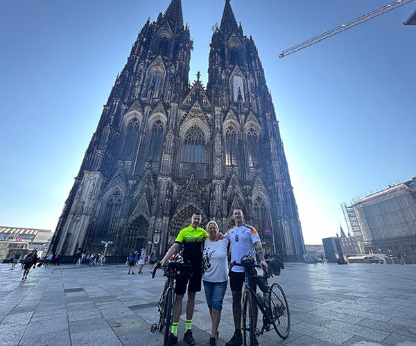 [Los ging es am Montag um 9 Uhr am Kölner Dom. Verabschiedet wurden die beiden dort von Anke Bidner, der Leiterin des Hospizdienstes Aggertal.]