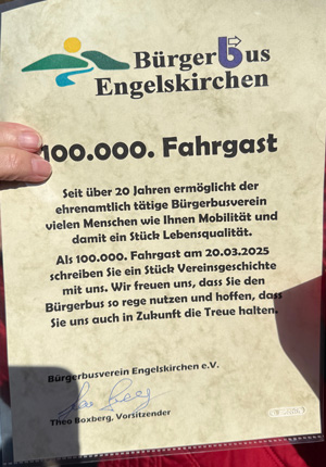 Engelskirchen – Die Vertreter Bürgerbusvereins überraschten heute den 100.000 Gast mit Gutschein, Blumen und Ehrenurkunde.