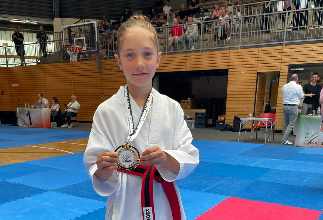 Die Landesmeisterschaft Taekwondo in der Disziplin Poomsae hat am Samstag in Bochum stattgefunden. Für den VfL Berghausen-Gimborn ging Aurora Wilke an den Start. Für sie ging es laut Mitteilung an diesem Tag nicht nur um eine gute Platzierung, sondern auch darum, ihren Status als Landeskader-Sportlerin der Nordrhein-Westfälischen Taekwondo Union zu festigen. Auf der Matte zeigte sie sich sicher und souverän, heißt es weiter. Sie beeindruckte die Kampfrichter mit ihrem kraftvollen Ausdruck und spektakulären Fußtritten. Damit konnte sie sich in ihrer Gruppe gegen 14 weitere talentierten Gegnerinnen durchsetzen und ihre Klasse gewinnen. Dank dieser Leistung durfte sich Aurora Wilke über die Goldmedaille und den Titel der Landesmeisterin freuen.