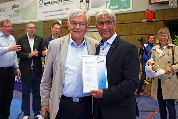 [Oben: Der TV Becketal begrüßte wieder zahlreiche Ehrengäste. Unten: Bajrus Saliu (re.) erhielt vom Vorsitzenden des Kreissportbundes, Hagen Jobi, die Ehrennadel in Silber.]