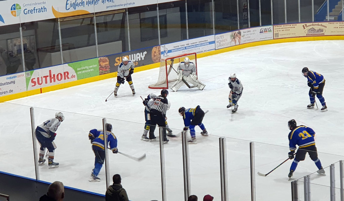 Die Penguins konnten am Wochenende in Grefrath verletzungs- und krankheitsbedingt nur mit einem kleinen Kader von elf Akteuren antreten. Die Grefrather hingegen konnten auf komplette vier Reihen zurückgreifen. Die Hausherren gingen dann auch mit hohem Tempo ins Spiel und bereits in der zweiten Spielminute in Führung. Wiehls Goalie Annalena Hummel vereitelte danach weitere gute Torchancen. Sean Liefert erzielte bei einem Konter in der zwölften Minute den Ausgleich. Im Verlauf des Drittels steigerten sich die Penguins und so ging es nach weiteren Toren auf beiden Seiten, Ben Kautschke war für Wiehl im Powerplay erfolgreich, mit 2:2 in die erste Pause.