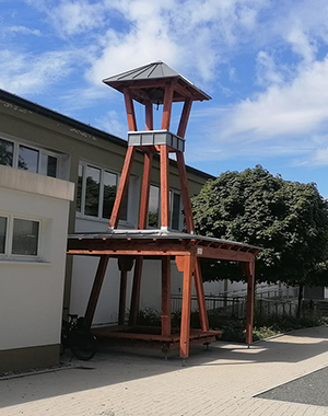 [Vor der Mehrzweckhalle steht ein neuer Glockenturm. Anders als das Original verfügt er über eine Sitzbank und einen Wetterschutz.]