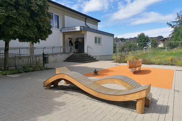 [Vor der Mehrzweckhalle gibt es neue Spielgeräte.]