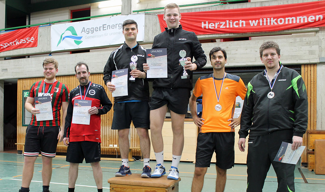 Am Zweier-Mannschaftsturnier mit Punkte-Vorgabe nahmen 15 Teams teil. Im Finale standen sich wie im Vorjahr vier Dümmlinghausener Spieler gegenüber. Der Pokal ging überraschend an Cedrik Figorra und Maximilian Kawczyk, die sich in der Gruppenphase noch gegen die Titelverteidiger Christopher Pfaff/Michael Gutsmuths geschlagen geben mussten. Im Endspiel setzten sich Figorra/Kawczyk jedoch mit 3:0 durch. Im Spiel um Platz drei behielten Thomas Matzkeit/Dominik Blum (Aggertaler TTC/TV Dümmlinghausen) gegen Roland Jahn/Sebastian Wolff (TTC Wiehl/TV Dümmlinghausen) die Oberhand.