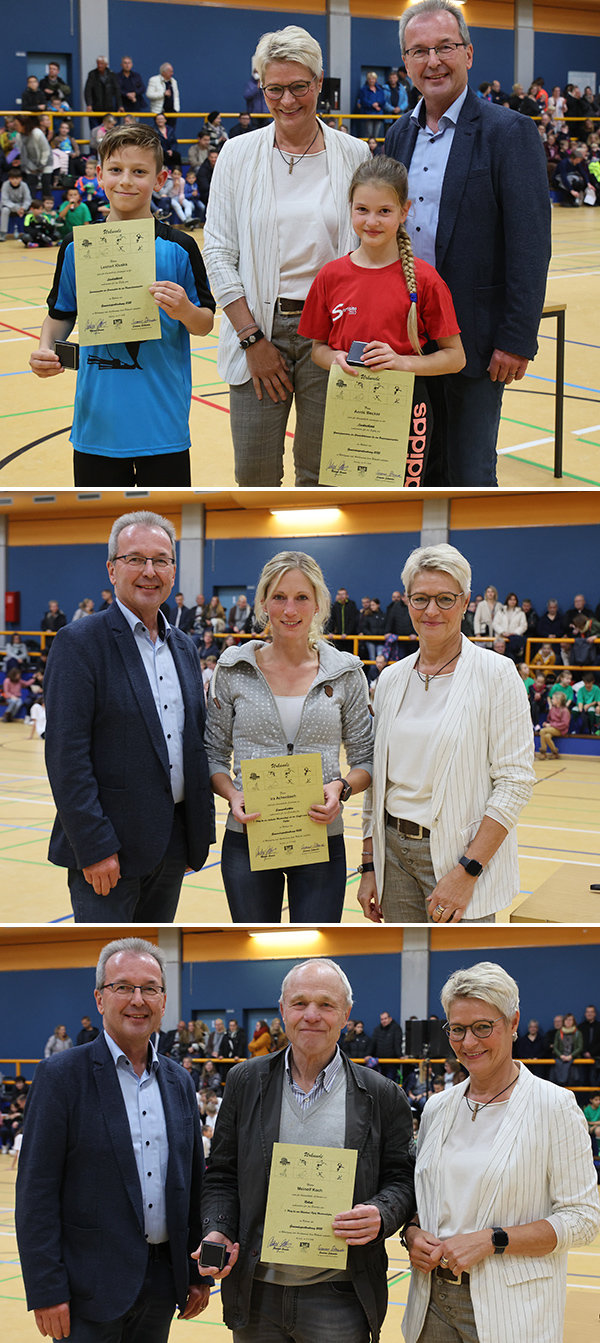 [Bürgermeister Rüdiger Gennies (li.) und Susanne Schneider ehrten unter anderem Lennart Kloska und Annic Becker (Oben, Gemeindemeister der Grundschulen bei den Bundesjugendspielen), Ira Achenbach