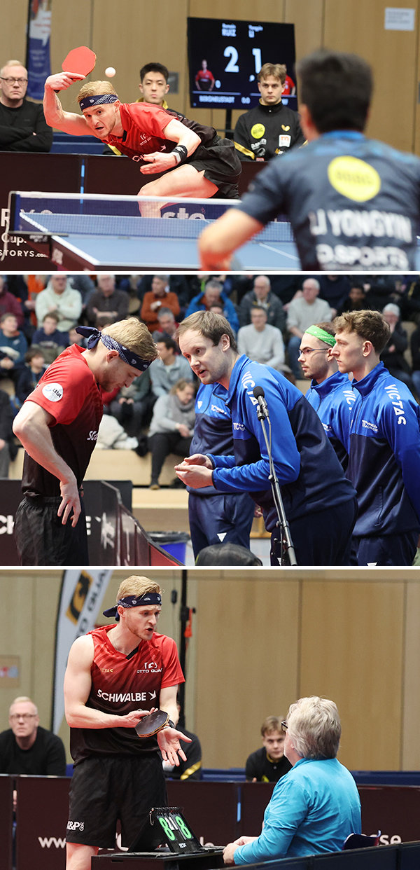 Den Vorsprung baute Duda anschließend auf 2:0 aus. Gegen Anton Källberg hatte der deutsche Nationalspieler bei seinem 3:0-Sieg stets die richtigen Antworten. „Es ist eigentlich gut aufgegangen, wir haben 2:0 geführt. Dann müssen wir eins der nächsten beiden Einzel gewinnen“, so Duda, der nun allerdings Düsseldorfs Comeback sah. Zunächst ließ Dang Qiu Leo de Nodrest bei seinem 3:0-Erfolg keine Chance. Anschließend ging Romain Ruiz gegen Källberg noch mit 1:0 in Führung, war anschließend gegen den Schweden aber vollkommen chancenlos und schaffte nur noch sechs Punkte in den kommenden drei Sätzen.