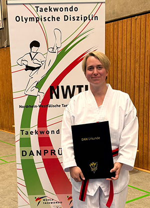 Tina Krüger ist die nächste Dan-Trägerin des VfL Berghausen-Gimborn. Sie legte am Sonntag in Bochum bei der zweiten Landes-Danprüfung ihre Prüfung ab. Hier traten insgesamt 40 Sportler aus ganz NRW vor die kritischen Augen der Prüfer der Nordrhein-Westfälischen Taekwondo Union (NWTU), um sich die Berechtigung zu verdienen, den schwarzen Gürtel zu tragen. Krüger hatte mehrere Monate intensiv auf diesen Tag hintrainiert. Sie startete mit guten Leistungen in ihre Prüfungen und konnte sich im Verlauf noch steigern. Besonders glänzte sie in der neu eingeführten Disziplin der Poomsae-Applikation, für die sie anerkennendes Nicken der Prüfer erntete. Als sie dann beim Bruchtest auch noch alle drei Bretter souverän durchschlug, bestand kein Zweifel mehr, dass sie die Prüfung bestanden hatte. Am Ende des Tages bekam sie von NWTU-Vizepräsident Franz-Peter Erberich ihre Urkunde zum 1. Dan überreicht und darf von nun an den schwarzen Gürtel tragen.