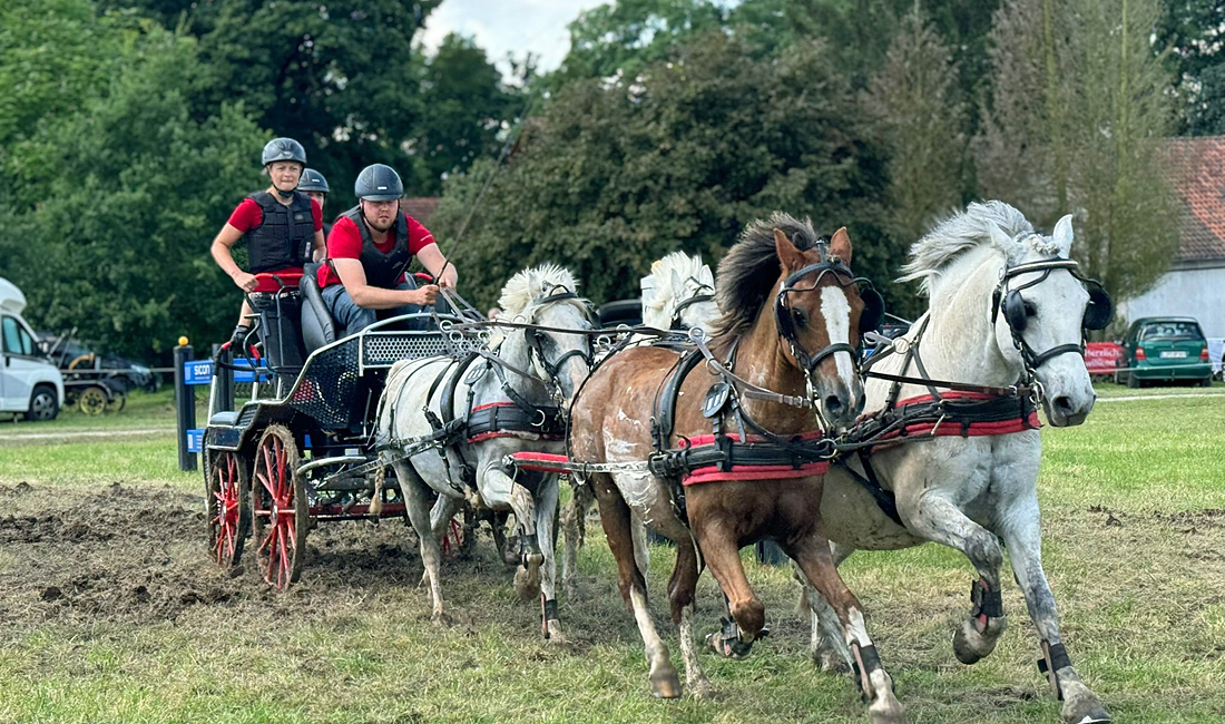 Kürzlich fanden auf der Anlage des Fahrvereins St. Medardus in Zülpich die Rheinischen Meisterschaften in Pferdefahrsport statt. Dabei zeigten die Mitglieder der Fahrsportfreunde Reichshof aus Eiershagen starke Leistungen. In der Klasse der Zweispänner-Ponys ging Leon Calligaris an den Start und sicherte sich die Silbermedaille. Andreas May wurde bei den Zweispännern-Pferden ebenfalls Zweiter und Bronze bei den Vierspänner-Ponys ging an Jan Schwanse. Auch andere Vierspänner-Fahrer des Vereins wussten in der laufenden Saison zu überzeugen. Marvin Peter ging zuletzt in Extertal an den Start und erreichte einen tollen zweiten Platz in der kombinierten Wertung der Klasse M. Sabrina Schneider und ihre Ponys waren zu Gast auf dem Hürsterhof in Ichenheim (Baden-Württemberg). Auch sie erzielte eine Platzierung in der Klasse S.