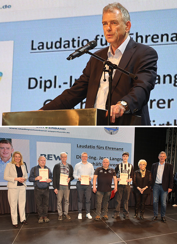 [BEW-Geschäftsführer Jens Langner bei seiner Laudatio zur Bedeutung des Ehrenamts im Sport (oberes Foto); Mit Ehrenurkunde und Verdienstnadel wurden langjährig engagierte Ehrenamtliche von Jens Langner, Monika Breidenbach und Bürgermeisterin Anne Loth ausgezeichnet (unteres Foto).]