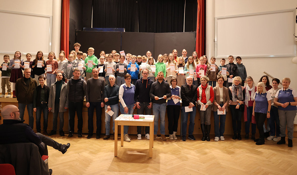 74 Kinder und 26 Erwachsene haben in Nümbrecht im vergangenen Jahr das Sportabzeichen bestanden. In Summe wurden damit 100 Urkunden verliehen. „Eine Punktlandung“, freute sich Bürgermeister Thomas Hellbusch bei der Verleihung der Abzeichen in der Aula des Gymnasiums. „Alle Kinder, Jugendliche und Erwachsene, die regelmäßig auf dem Sportplatz trainiert haben, haben dabei etwas Beeindruckendes erreicht“, sagte Hellenbusch. Hinter den verliehenen Abzeichen in Bronze, Silber und Gold stünde viel mehr als „nur“ eine Urkunde. Er hob hervor, dass die Teilnehmer nicht nur in einer Sportart gut sein müssten, um dieses Ehrenabzeichen der Bundesrepublik Deutschland zu ergattern. Der Breitensport verlange Ausdauer, Kraft und Koordination in verschiedenen Disziplinen.