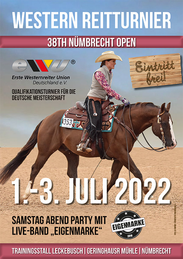Nach zweijähriger Corona-Pause finden vom 1. bis 3. Juli die 38. Nümbrecht Open, ein Qualifikationsturnier zur Deutschen Meisterschaft der Westernreiter, statt. Rund 200 der besten Westernreiter Deutschlands werden mit ihren Pferden erwartet. Das Tal der Geringhauser Mühle wird dann für ein langes Wochenende zum Western Camp und es gibt für drei Turniertage Western-Reitsport der Spitzenklasse zu sehen. Zudem findet am Samstagabend eine große Party mit Livemusik der lokalen Rockband „Eigenmarke“ im Innenhof des Trainingsstall Leckebusch statt. Der Eintritt hierzu ist frei.