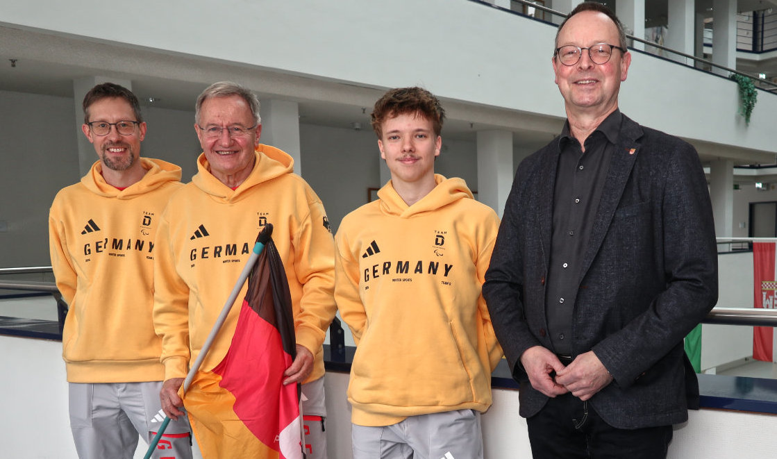Der Allgemeine Vertreter des Landrats, Stefan Heße, hat die oberbergische Delegation bei den Paralympischen Winterspielen nach Cortina d’Ampezzo verabschiedet: Para Eishockey-Nationalspieler Jano Bußmann, Friedhelm Julius Beucher, Ehrenpräsident des Deutschen Behindertensportverbandes (DBS) - beide aus Bergneustadt - sowie Kevin Müller aus Engelskirchen-Ründeroth, stellvertretender Pressesprecher des Teams Deutschland Paralympics.