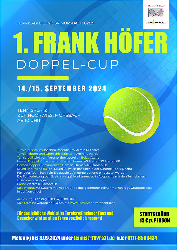Am Wochenende 14./15. September veranstaltet der SV Morsbach auf der Tennisanlage „Zur Hoorwies“ in Gedenken an das kürzlich verstorbene Vorstandsmitglied Frank Höfer ein großes Doppelturnier. Meldungen sind in etlichen Altersklassen möglich ( tennis@TAW.s2t.de oder Tel.: 0177/65 83 434). „Der Tennisverein ist sich sicher, dass nach der nahezu abgeschlossenen Sommersaison bei vielen Aktiven noch große Lust am Wettbewerb besteht und hofft daher auf zahlreiche Meldungen“, teilte der Verein mit.