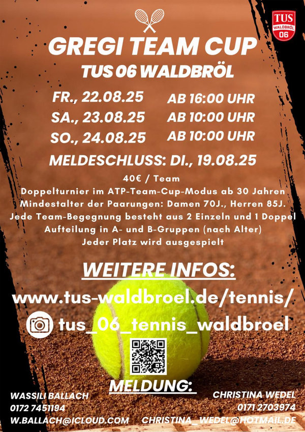 Vom 22. bis 24. August veranstaltet die Tennisabteilung des TuS 06 Waldbröl zum dritten Mal den Gregi-Team-Cup. Das Doppelturnier wird im ATP-Cup-Modus ausgetragen und führt Männer und Frauen ab 30 Jahren in einem Team zusammen. Erwartet werden Spieler aus dem gesamten Oberbergischen Kreis. Als Schirmherrin tritt Bürgermeisterin Larissa Weber auf.