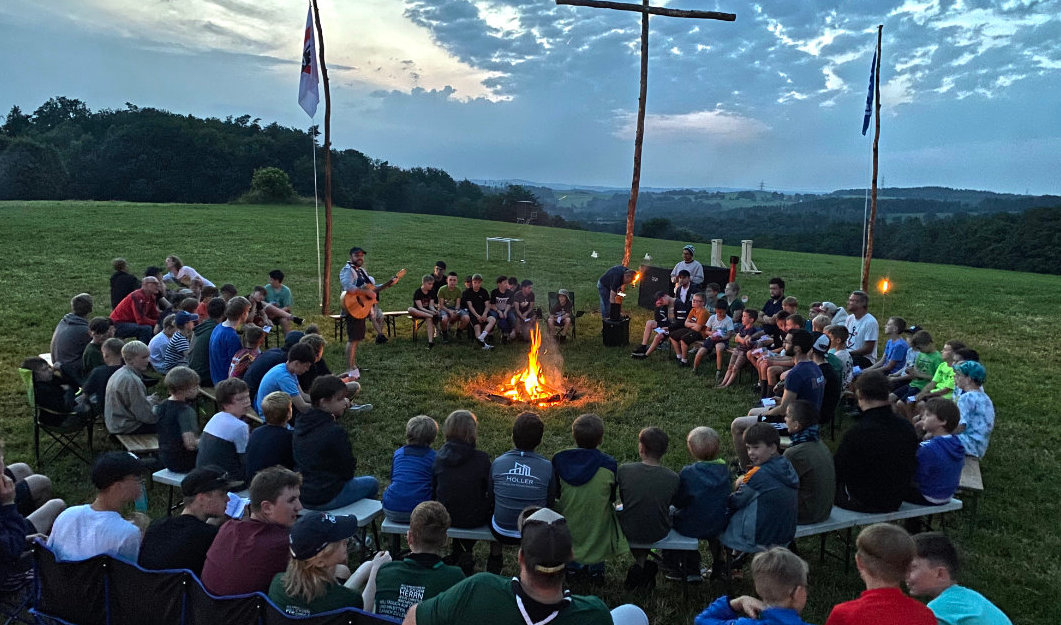 „Mit Jesus Christus – Mutig voran!“ – der traditionelle Jungschar-Ruf schallte zum Abschluss des Jungschartages 2025 vom Zeltplatz am Windrad zwischen den Waldbröler Ortschaften Hermesdorf, Bettingen und Geiningen hinab ins Tal. Der CVJM Hermesdorf veranstaltete Mitte Juni das diesjährige Zelt-Wochenende mit Spiel und Spaß unter dem Motto „Jesus, Dein Lokomotivführer. Er leitet Dich wie auf Schienen“. Auch eine Herausforderung am nahe gelegenen Kömpeler Tunnel, durch den schon lange keine Züge mehr fahren, durfte bei den Spielen rund ums Thema Eisenbahn nicht fehlen.