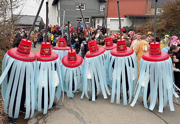 Und mittendrin? Die legendären Schönenbacher Määädchen. Seit 22 Jahren verpassen sie keinen einzigen Zoch und haben jedes Jahr außergewöhnliche Verkleidungen. Als „#wischenimpossible“ fegten sie mit ihren Wischmopp-Kostümen Schürmichs Straßen gleich wieder sauber, getreu ihrem Motto: „Wir Määädchen lassen gerne wischen, während wir ein Bierchen zischen!"
