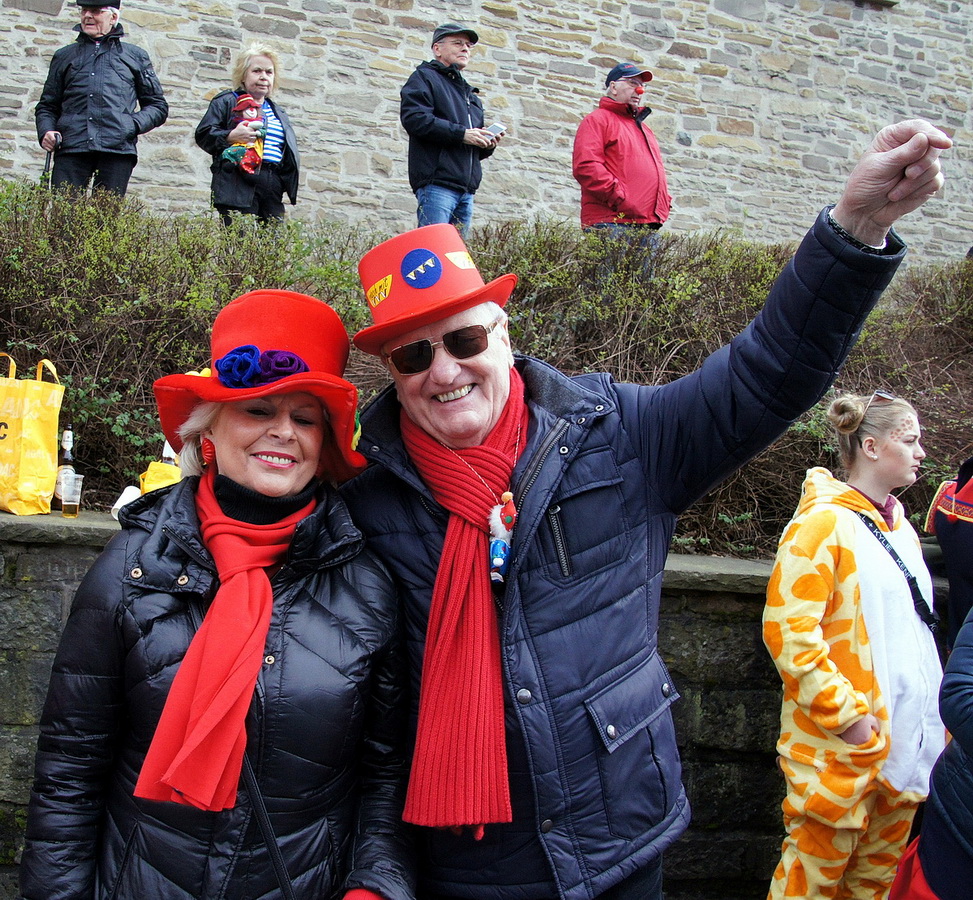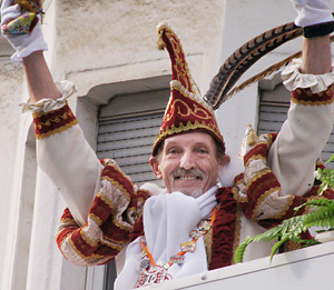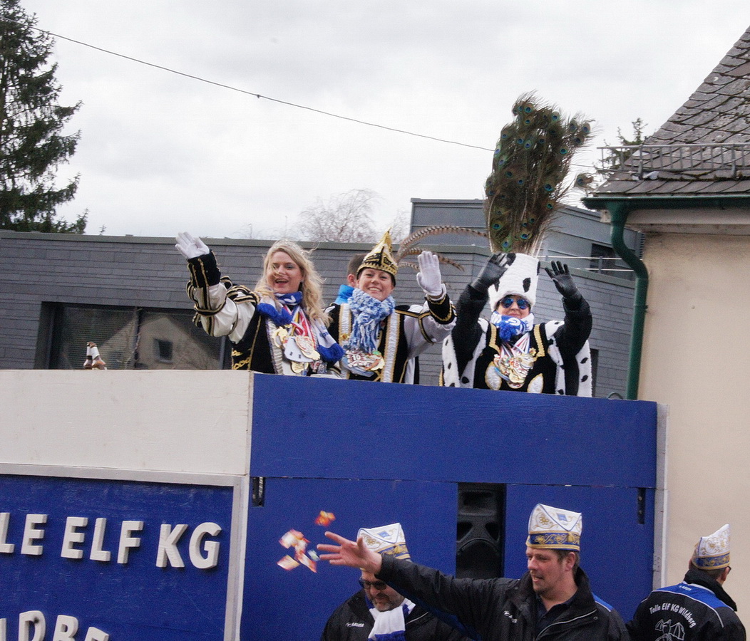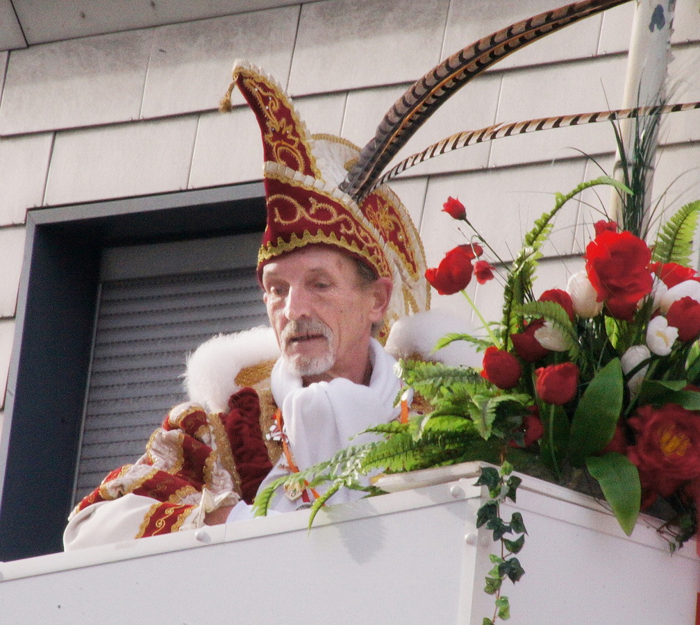 Traditionell ist der letzte Wagen der Prinzenwagen: Prinz Manni I. ließ sich von dem jecken Volk ausgiebig feiern. Unterstützt wurde er auf dem Prinzenwagen von Bürgermeister Peter Koester, der zusammen mit seiner Ehefrau mit vollen Händen Kamelle warf.