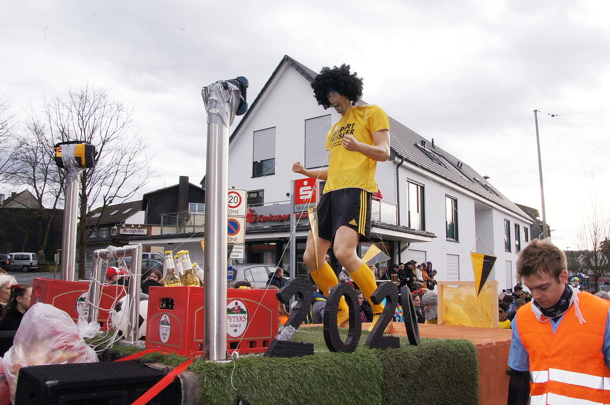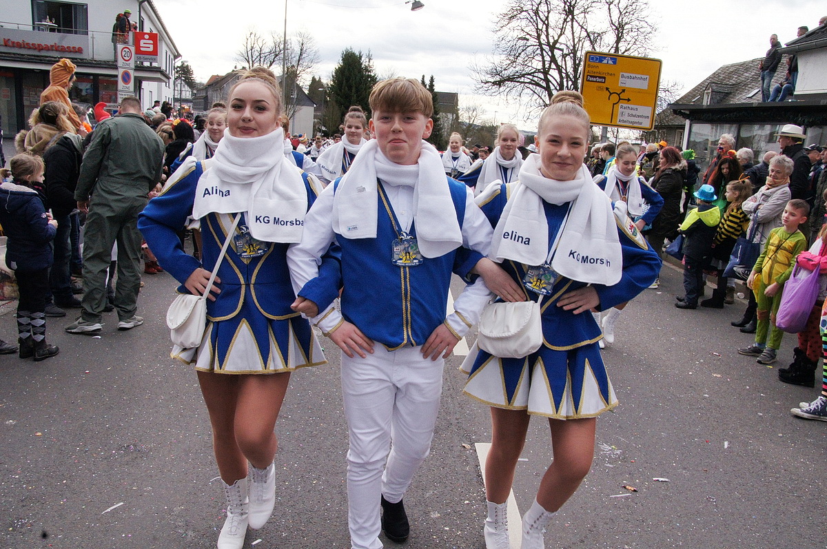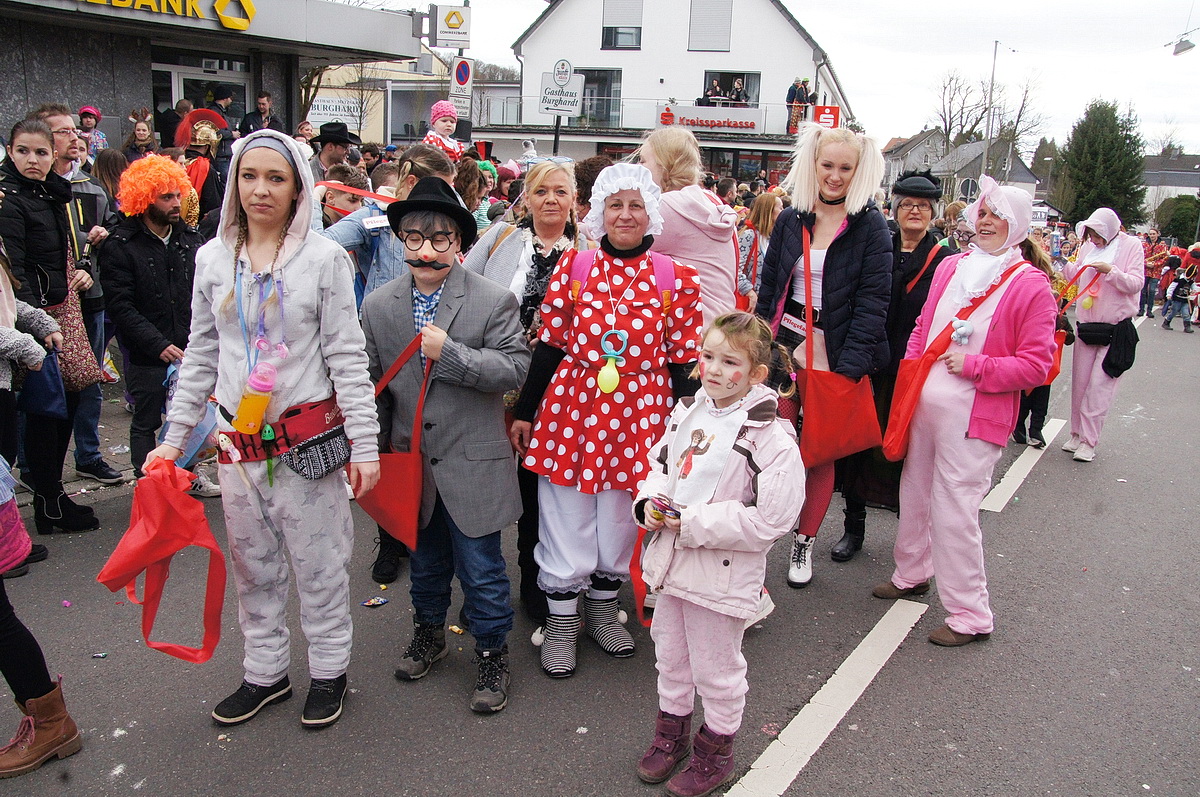 Gleich darauf folgte der Musikzug Lichtenberg - in tollen Kostümen und musikalisch unterhaltsam, ein wahrer Hingucker. Die KG Dattenfeld, mit Prunkwagen und Kinderprinzenpaar Jule I. und Finn II., warfen jubelnd Kamelle unter das Fußvolk. „Aufgepasst am Rande, hier kommt die Hermesdorfer Buddelbande“, hatte sich das DRK Familienzentrum Hermesdorf als Motto ausgesucht. Als besonders wurffreudig zeigte sich die Besatzung des Wagens von „Pro Glas“. „Den Mangel der Fachkräfte haben wir bedacht, und unseren Nachwuchs selbst gemacht“, hatte sich die AWO auf die Fahne geschrieben.