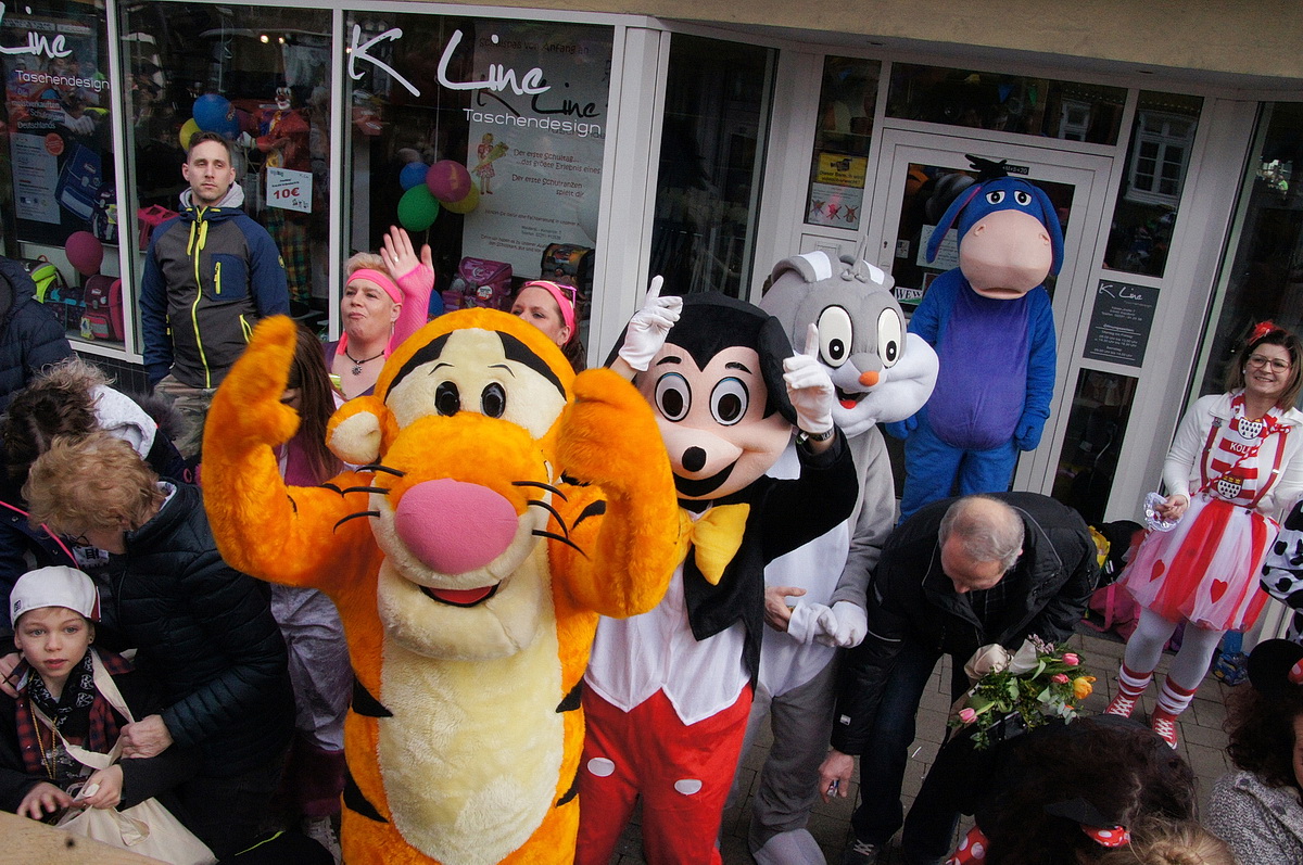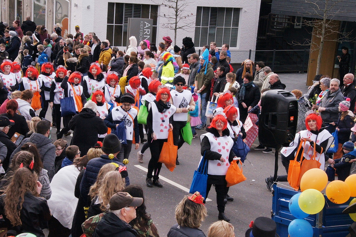 Bei strahlendem Sonnenschein und vergleichsweise milden Temperaturen warteten alle auf den närrischen Lindwurm, der sich um 14:11 Uhr von Marktplatz kommend in die Innenstadt bewegte. Es war der bisher größte Karnevalszug mit rund 40 Mottowagen, Musikkapellen und Fußgruppen. Jubelnd wurde der mit knallroten Luftballons geschmückte Wagen der WKG als Führungsfahrzeug begrüßt.