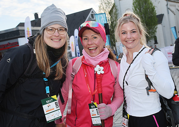 Unter den Teilnehmern sind auch zahlreiche Wanderer aus dem Oberbergischen. Renate Groneuer (Foto Mitte/mit Freundinnen) aus Engelskirchen, die für das Entsorgungszentrum Leppe startet, geht bereits zum wiederholten Mal auf die Strecke – und hat sich ehrgeizige Ziele gesetzt: „Ich konnte mich jedes Jahr steigern. Vielleicht wird es diesmal nur eine Minute, aber ich gebe mein Bestes.“ Gut acht Stunden wird sie unterwegs sein. Die 50 Kilometer schrecken sie nicht: „Das ist kein Problem – ich trainiere regelmäßig auf der großen Treppe auf Metabolon.“