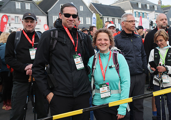 Ebenfalls am Start ist die Familie Arnold aus Kürten, die bereits zum dritten Mal teilnimmt. „Mit mehreren Kleidungsschichten sind wir gut vorbereitet“, berichten sie mit Blick auf die großen Temperaturunterschiede im Tagesverlauf. Teilnehmerin Angela ist eigens aus Köln angereist und hat in Wipperfürth übernachtet. Für sie steht vor allem der persönliche Anspruch im Vordergrund: „Man braucht einfach viel Willen.“ Nachdem sie im vergangenen Jahr nach 30 Kilometern aufgeben musste, will sie diesmal unbedingt das Ziel erreichen.