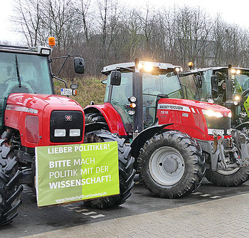 [Mit Plakaten waren die Traktoren ausgestattet, mit denen die Teilnehmer zur Infoveranstaltung fuhren.]