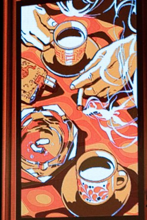 Die passenden Illustrationen von Kat Menschik wurden an die Leinwand projiziert. „Wir kennen die Geschichte erst, wenn sie aufgeschrieben ist. Diese Rückschau fand ich genial. Ich konnte so viele Sachen, wie Schuld und Geschichte abarbeiten. Für Raths Zimmer im Altenheim stellte ich mir sofort braune Vorhänge, Kaffee und den Geruch von Zigaretten vor. Diese besondere Atmosphäre habe ich gezeichnet“, erzählte Menschik.