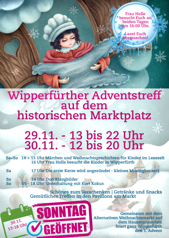 Auf dem Marktplatz gibt es weihnachtliche Musik, Frau Holle und ihre Helfer erheitern die Kinder und für das leibliche Wohl ist unter anderem mit Flammlachs, Grünkohl und Glühwein gesorgt. Der große Weihnachtsbaum wird Ende November auf dem Marktplatz aufgestellt, viele kleinere Bäume werden die Innenstadt verschönern und eine vorweihnachtliche Atmosphäre schaffen. Bereit gestellt werden sie von der Wipperfürther Wohnungs- und Entwicklungsgesellschaft WEG.