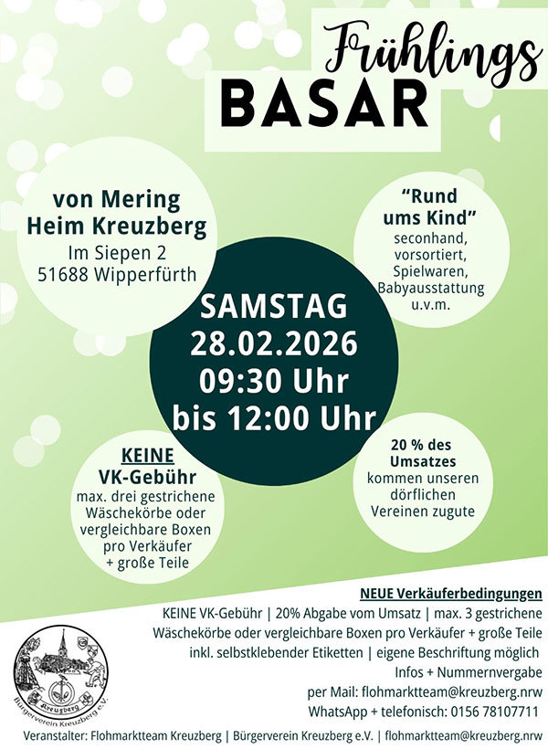 Am Samstag, 28. Februar, findet in Wipperfürth-Kreuzberg im Von-Mering-Heim ein Basar für Frühjahrs- und Sommerbekleidung statt. Los geht es um 9:30 Uhr. Zehn Prozent des Verkaufserlöses soll den dörflichen Vereinen zugutekommen.