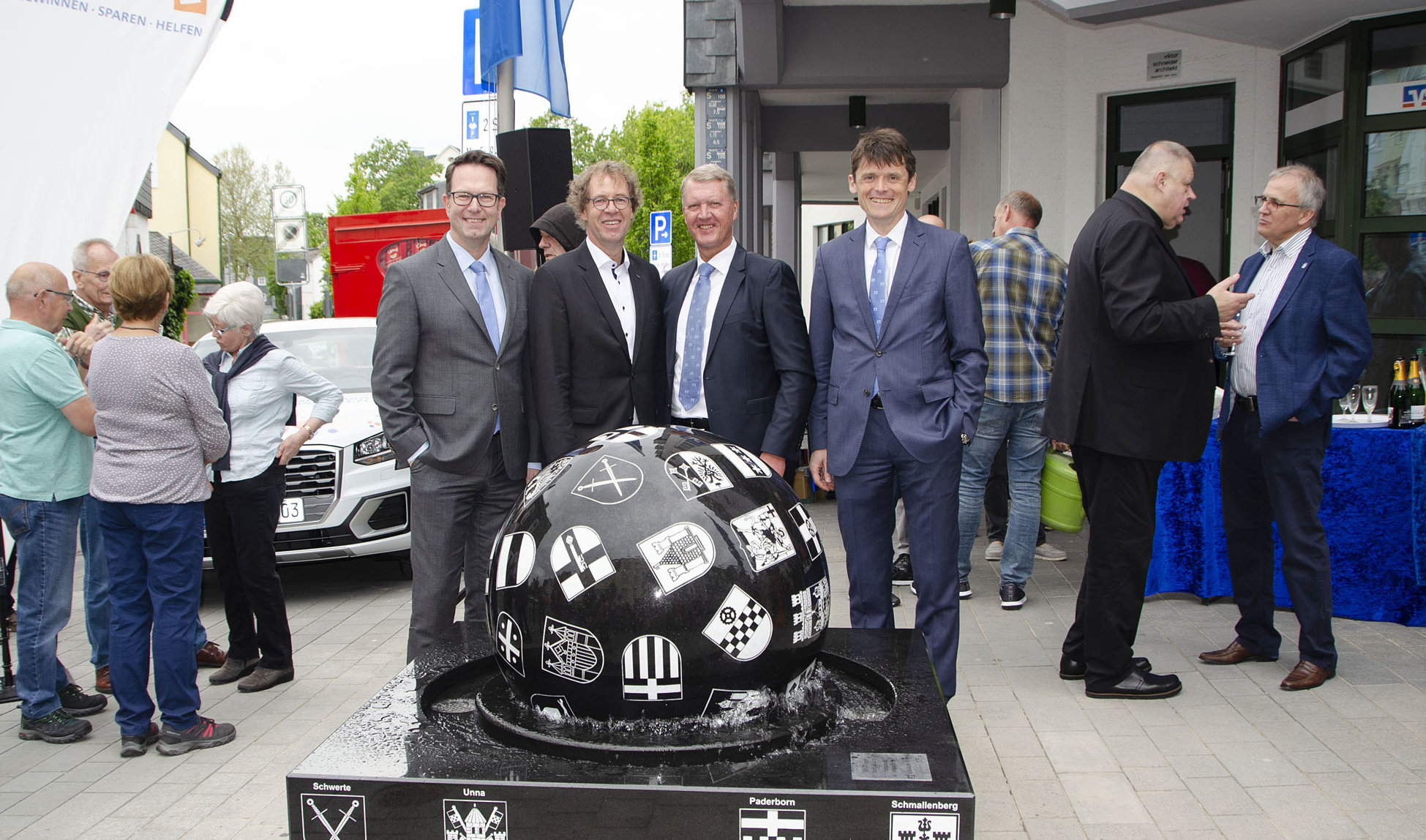 „Wir kombinieren hier das in unserer Region bedeutende Element Wasser mit dem Städtebund der Hanse und glauben, dass das ein perfektes Geschenk für die älteste Stadt im Bergischen Land ist“, unterstreicht Helmut Vilmar, Vorstandsmitglied der Volksbank Berg. Bürgermeister Michael von Rekowski zeigte sich begeistert von der interessanten Dynamik des insgesamt über drei Tonnen schweren Kugelbrunnens: „Ich hätte nicht gedacht, dass man eine Kugel, die rund eine Tonne wiegt, so geschmeidig auf einem dünnen Wasserfilm bewegen kann.“