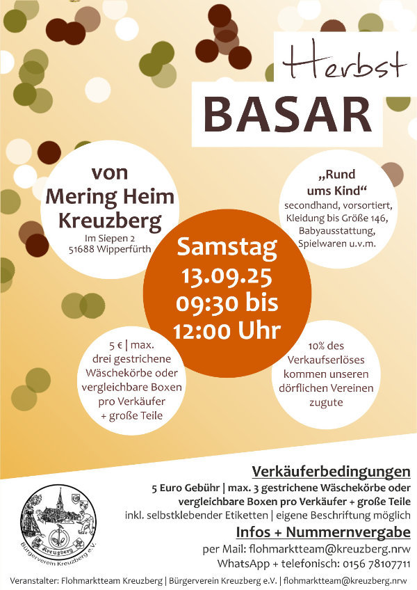 WIPPERFüRTH Herbstbasar in Kreuzberg TEILEN Red; 26.08.2025, 08:14 Uhr Wipperfürth - Am Samstag, 13. September, findet im Von-Mering-Heim wieder ein Basar für Herbst- und Winterbekleidung statt. WERBUNG
