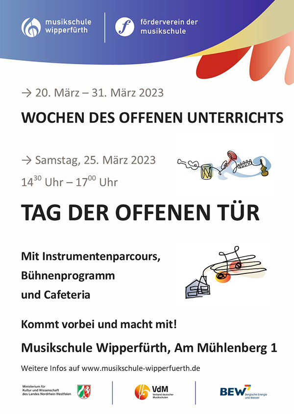 Die Musikschule Wipperfürth und der dazugehörige Förderverein laden zum diesjährigen Tag der offenen Tür ein. Veranstaltet wird dieser am Samstag, 25. März. Besonderes für alle musikinteressierten Kinder in Wipperfürth und Umgebung wurden zahlreiche Aktionen geplant. Die diversen Ensembles der Musikschule werden ihre Instrumente vorstellen, die anschließend im Instrumentenparcours ausprobiert werden können. Für das leibliche Wohl sorgt traditionell der Förderverein mit Kaffee und Kuchen. Der Tag der offenen Tür beginnt um 14:30 Uhr. Umrahmt wird dieser von den Wochen des offenen Unterrichts. Vom 20. bis zum 31. März können Interessierte jeweils zwischen 15 und 18 Uhr bei einem Unterricht der Wahl hospitieren.