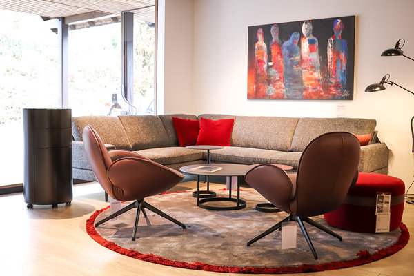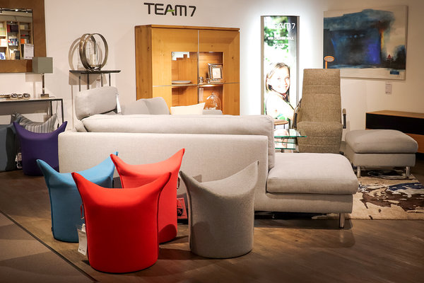 Links vom Eingangsbereich kommt man zu diversen Sofas und Sesseln von namhaften Herstellern wie ERPO und JORI. Außerdem findet man hier einige Hängeleuchten-Varianten vom deutschen Leuchtenhersteller TOBIAS GRAU. So ist es einem möglich, die Leuchten direkt miteinander zu vergleichen. Eine hochwertige TEAM 7 Echtholzküche in U-Form trennt die Bereiche: „Lebensräume“ und das integrierte Küchenstudio.
